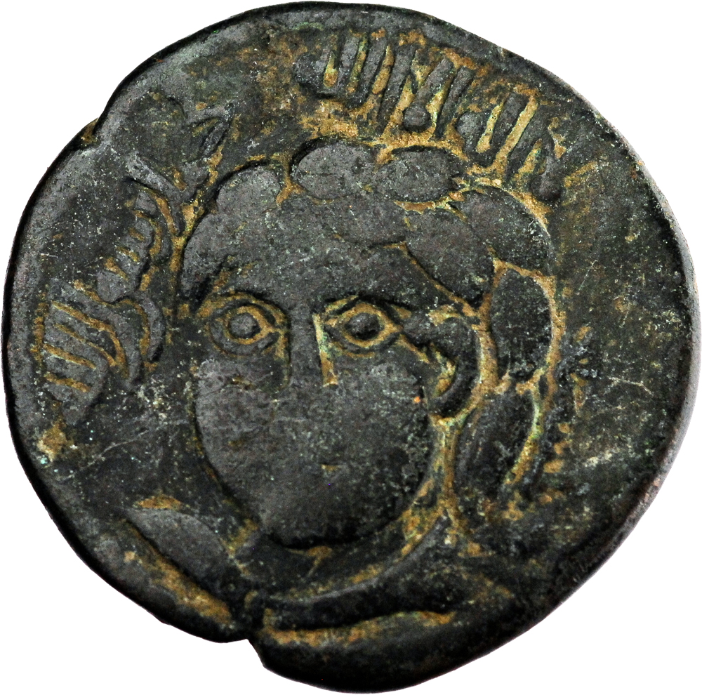 Buste drapé, tête nue, aux longs cheveux, de face légèrement à gauche.