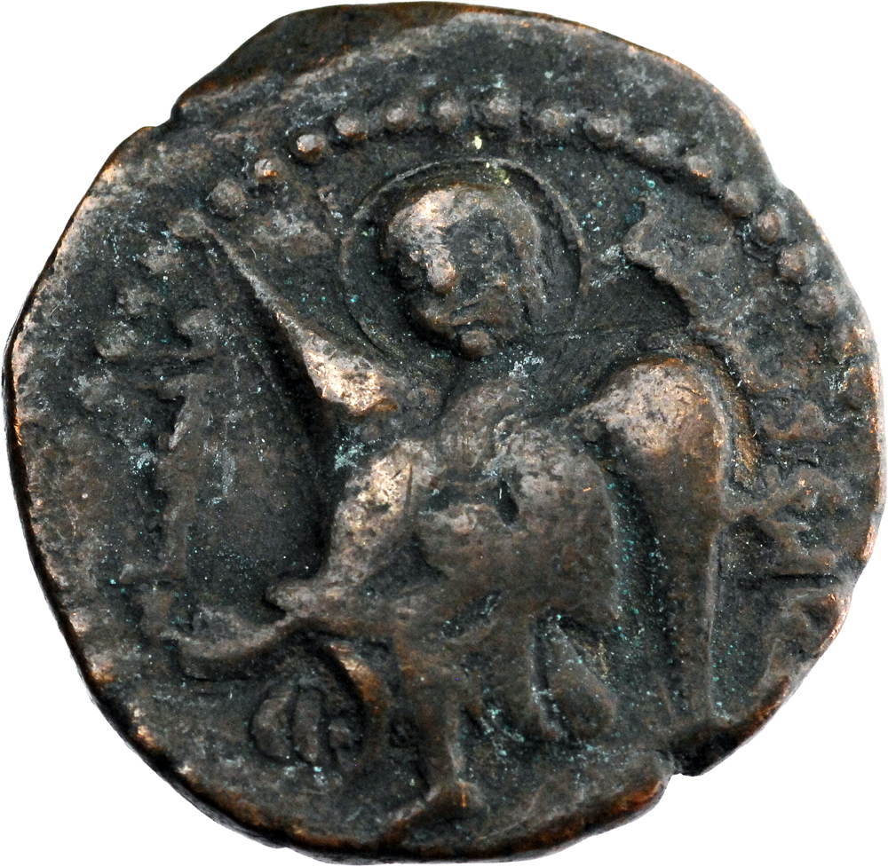Ange nimbé de face, l’aile droite levée, portant un serpent.