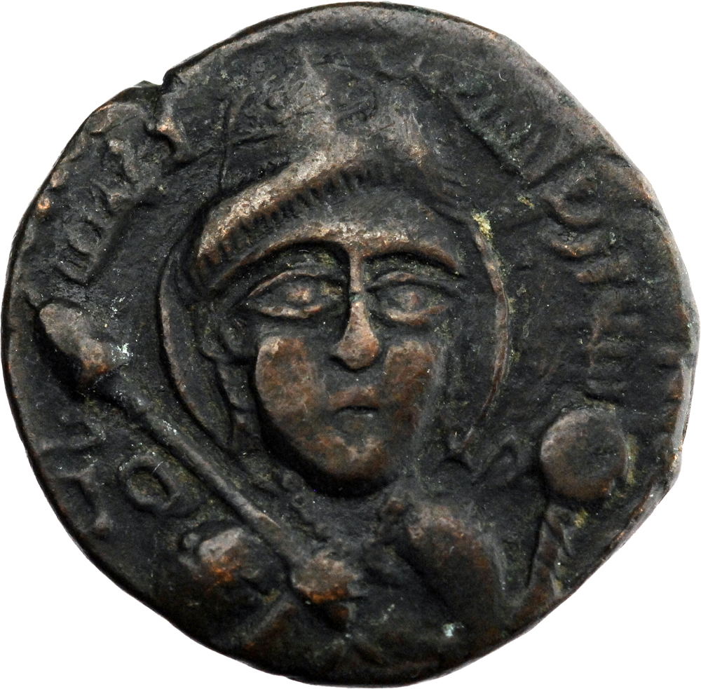 Buste drapé de face légèrement à droite, portant une coiffe à frange, tenant un globe et un sceptre. Beau portrait.