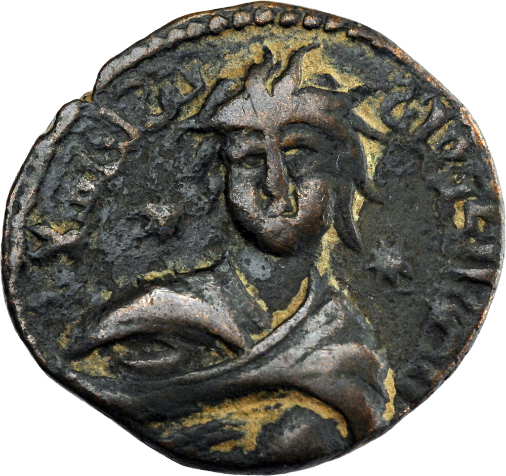 Buste drapé et diadémé de face légèrement à gauche ; une étoile de part et d’autre.