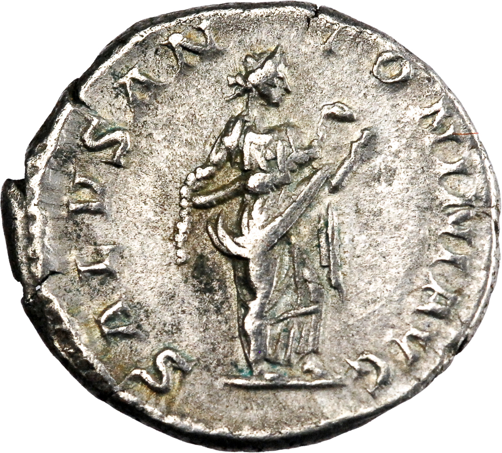 IMP CAES ANTONINVS AVG Buste lauré, drapé et cuirassé à droite. Rev : SALVS ANTONINI AVG Salus debout de face, la tête à droite, nourrissant un serpent tenu dans ses bras.