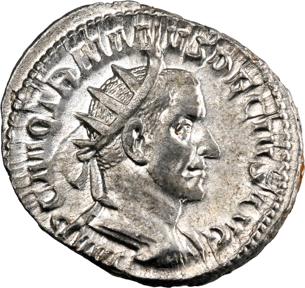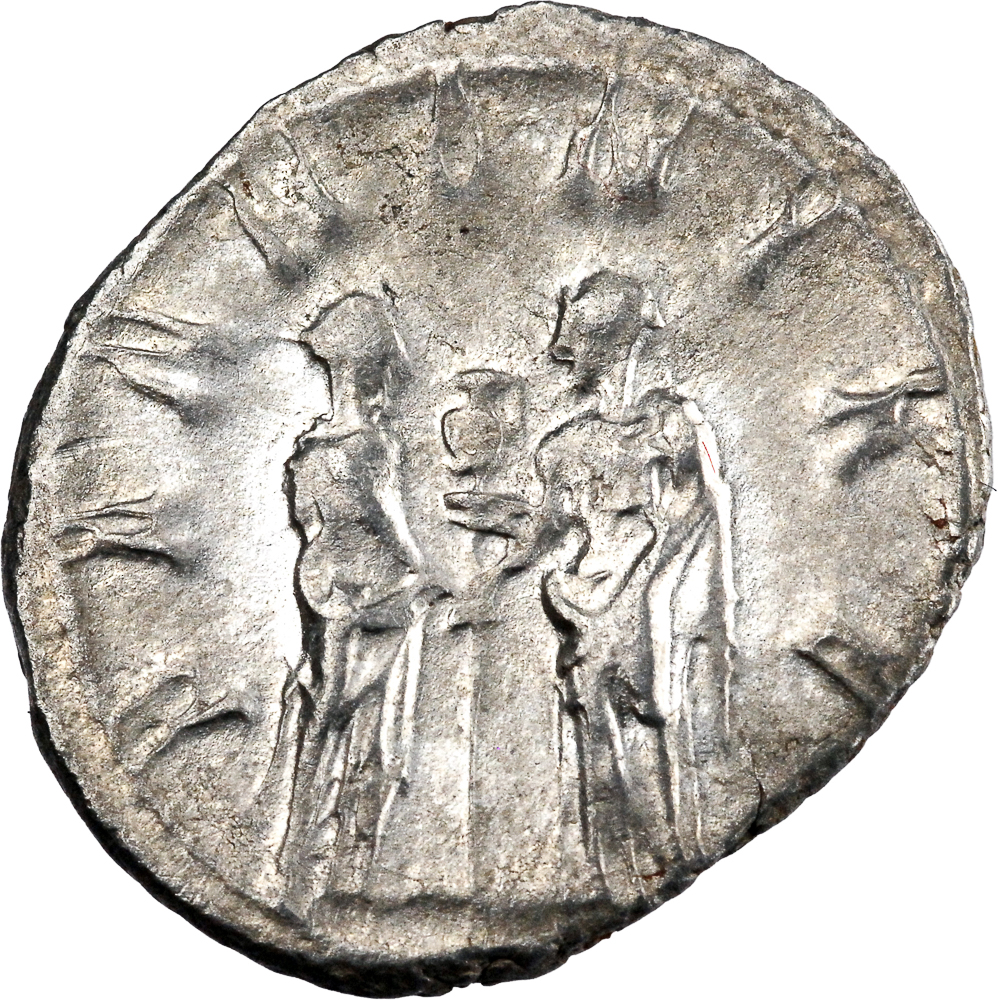 IMP C M Q TRAIANVS DECIVS AVG Buste radié et cuirassé de Trajan Dèce à droite, vu de dos. Rev : PANNONIAE Les deux Pannoniae se font face et joignent leurs mains droites ; à l’arrière-plan, signum.