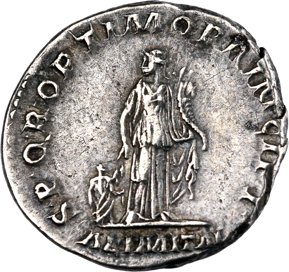 IMP TRAIANO AVG GER DAC P M TR P COS VI P P. Buste lauré de Trajan à droite, drapé sur l’épaule gauche. Rev : S P Q R OPTIMO PRINCIPI // ALIM ITAL. Annona debout à gauche, tenant deux épis et une corne d’abondance.