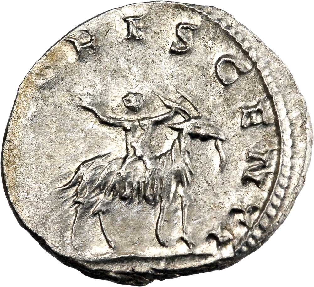 VALERIANVS CAES Buste radié et drapé de Valérien II à droite. Rev : IOVI CRESCENTI Jupiter enfant chevauchant une chèvre à droite.