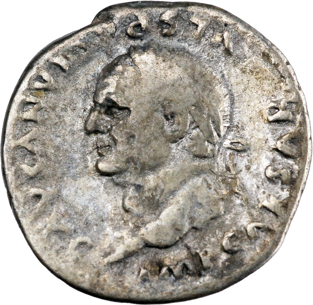 IMP CAESAR VESPASIANVS AVG Tête laurée de Vespasien à gauche. Rev : COS VIII Mars, casqué, nu à l’exception du manteau qui lui entoure la taille, debout à gauche, tenant une lance inclinée vers le haut dans la main droite et un trophée sur l’épaule gauche dans la gauche.