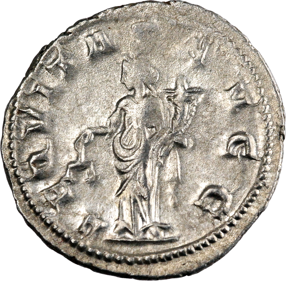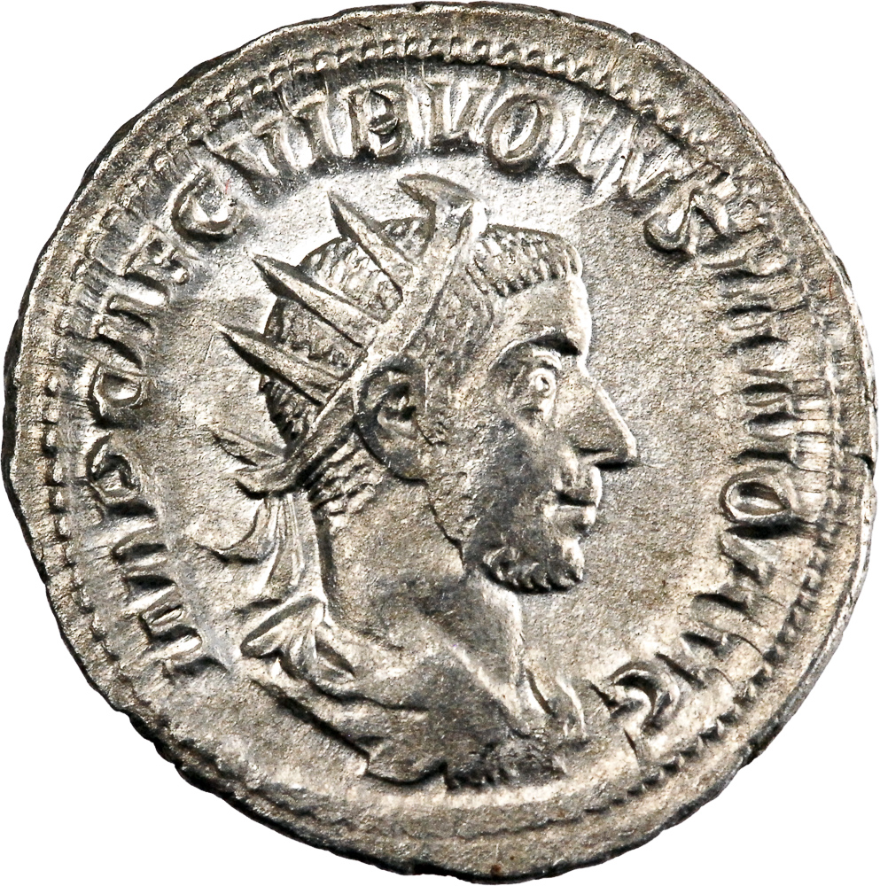IMP CAE C VIB VOLVSIANO AVG Buste radié, drapé et cuirassé de Volusien à droite, vu de dos. Rev : AEQVITAS AVGG Aequitas debout de face, la tête à gauche, tenant une balance dans sa main droite et une corne d’abondance dans sa main gauche.