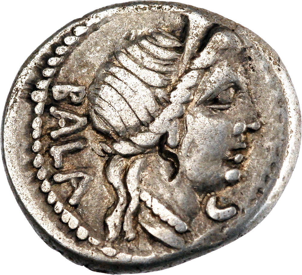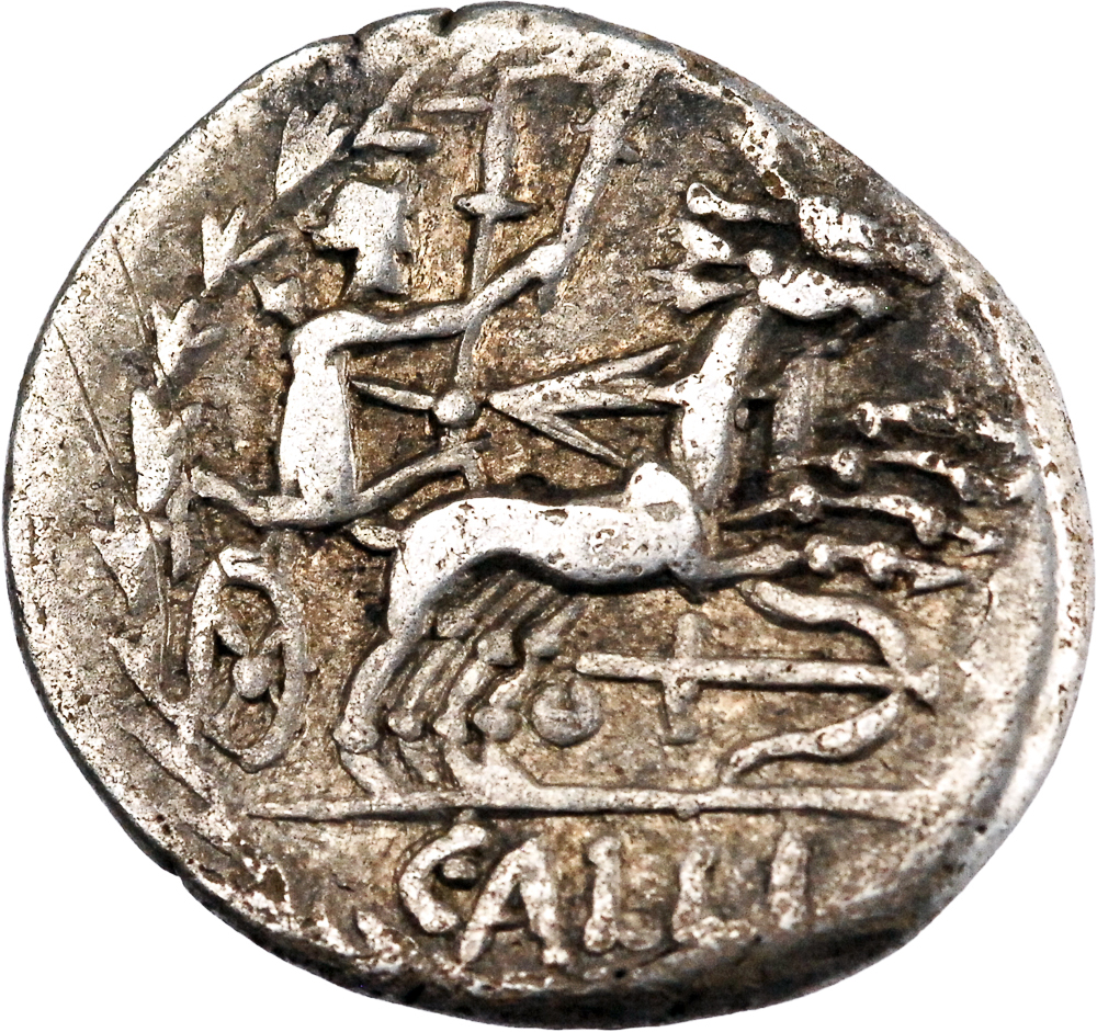 BALA Tête de femme diadémée à droite ; sous le menton, C. Rev : Diane dans un bige de cerfs à droite ; avec un carquois sur l’épaule et tenant un sceptre et des rênes dans la main gauche et une torche dans la droite ; sous les chevaux, une ancre. En exergue, C·ALLI. Le tout dans une couronne de laurier.