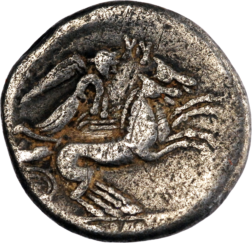 Tête de Roma à droite, derrière elle marque de contrôle Q. Rev : D SILANVS L F / ROMA Victoire avec fouet et branche de palmier sur un bige chevauchant à droite, dans le champ au-dessus V.