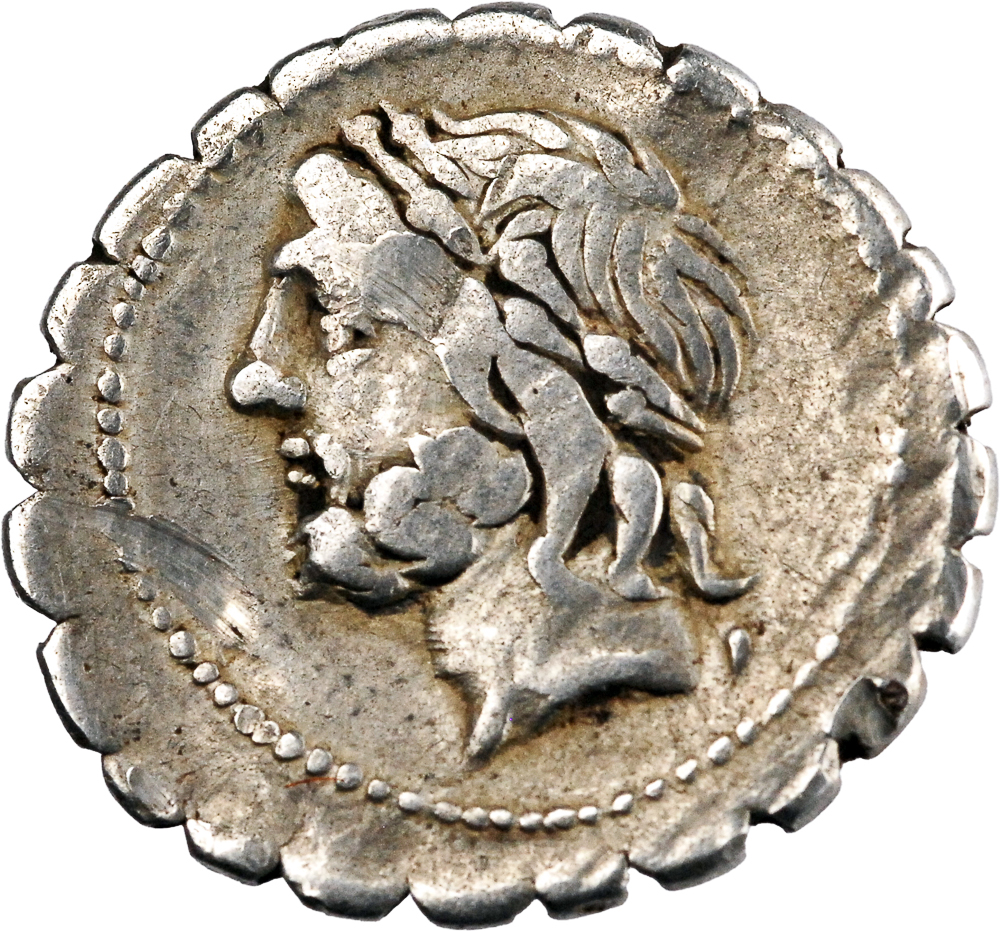 Tête laurée de Jupiter à gauche. Revers : L·SCIP·ASIAG. Jupiter conduisant un quadrige au galop à droite, tenant un sceptre et les rênes de la main gauche et se préparant à lancer la foudre de la main droite ; au-dessus, B (marque de contrôle) à gauche du sceptre.