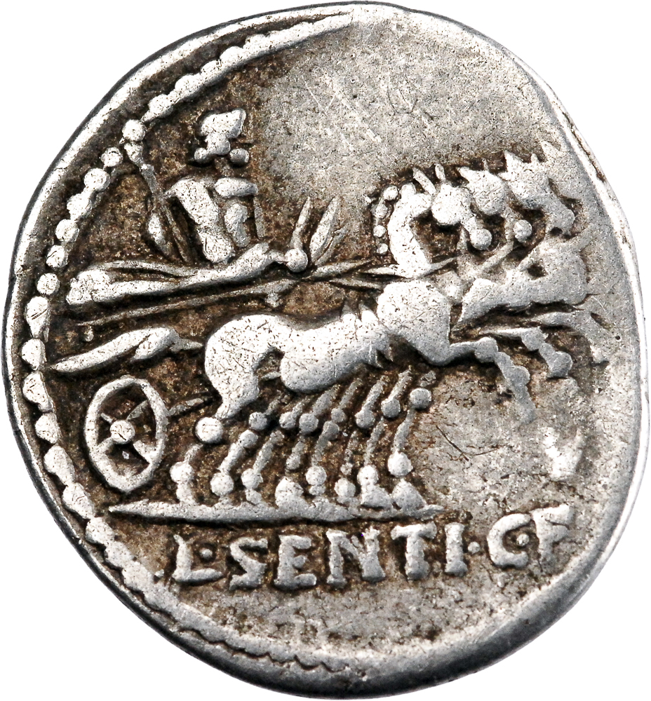 AR G•PVB Tête de Rome à droite, portant un casque ailé, une boucle d’oreille pendante et un collier de perles. Rev : L•SENTI•C•F Jupiter conduisant un quadrige à droite, tenant un sceptre de la main droite et les rênes et un foudre de la main gauche ; sous les chevaux, I.