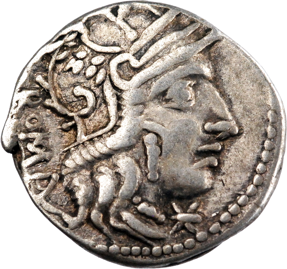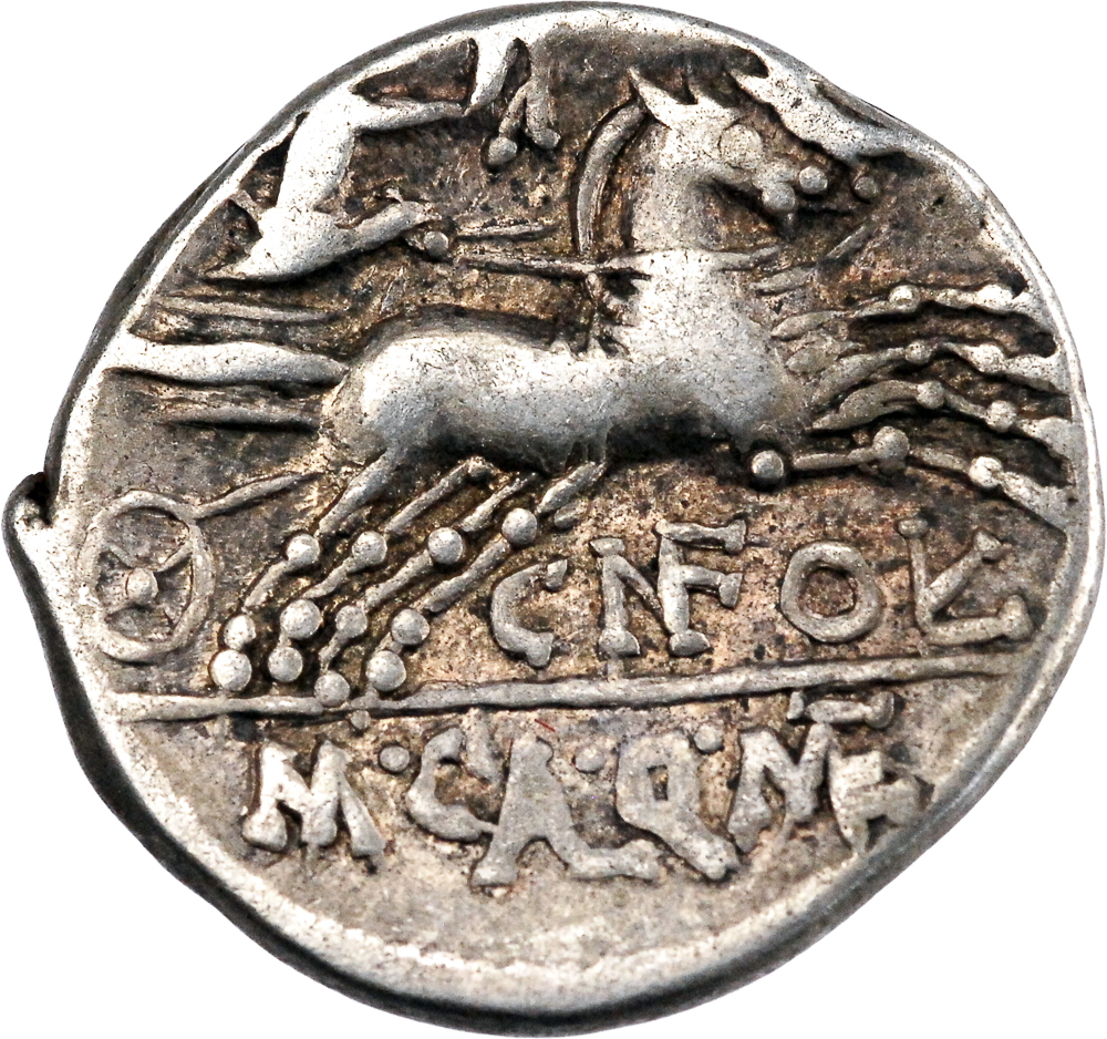 ROMA Tête casquée de Rome à droite ; sous le menton, monogramme XVI (marque de valeur). Rev : CN FOVL M•CAL•Q•MET Victoire conduisant un bige à droite, tenant les rênes dans sa main droite et une couronne dans sa main gauche.