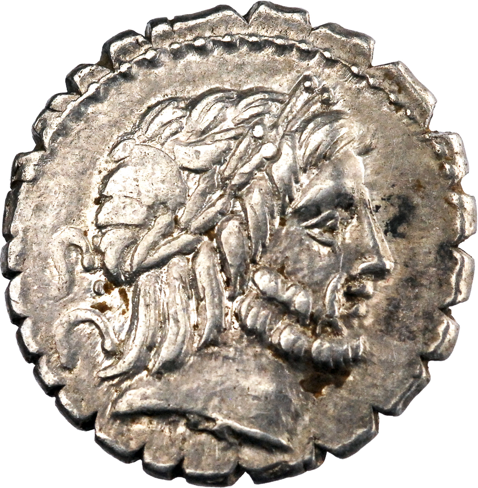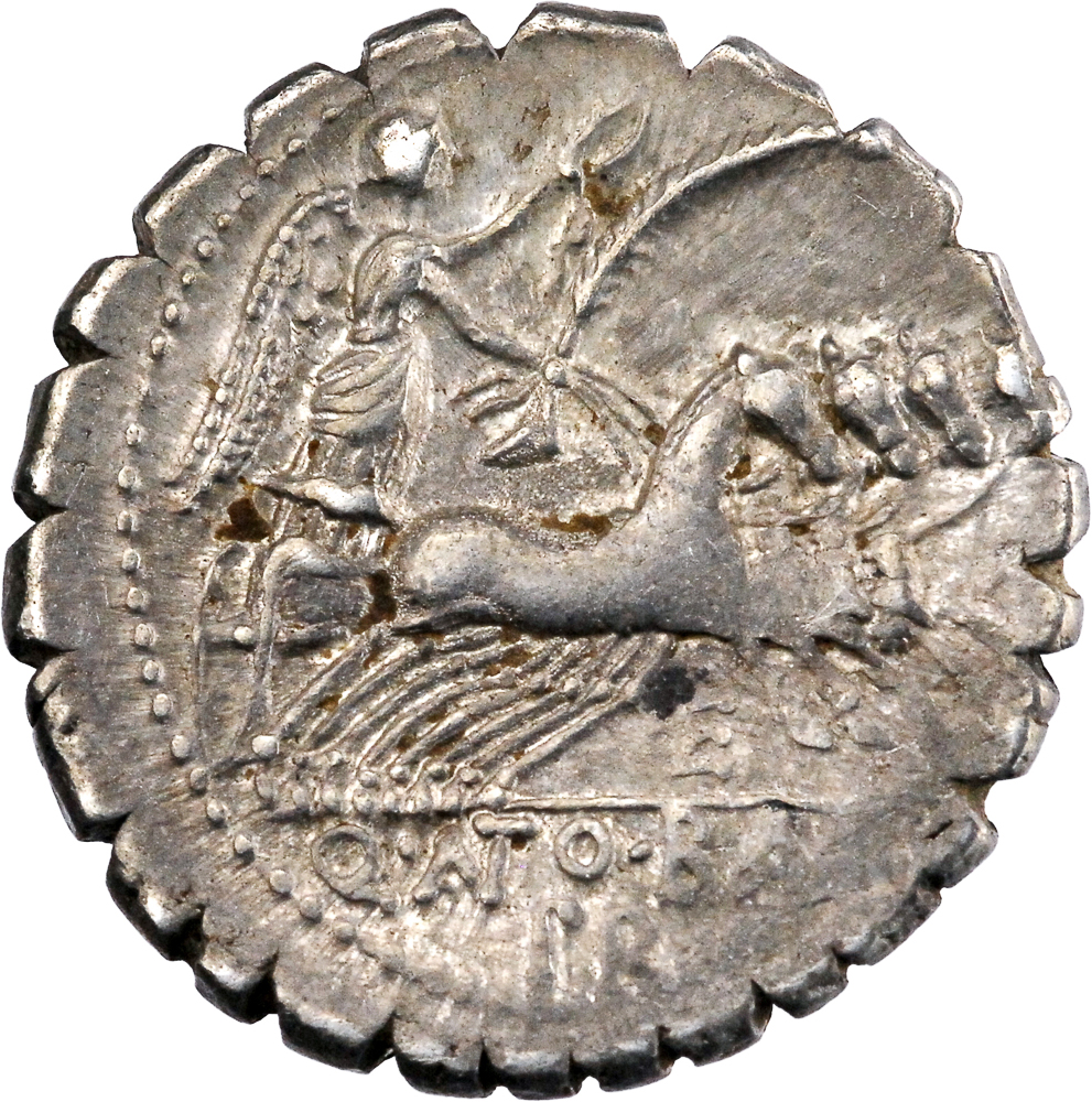 Tête laurée de Jupiter à droite, derrière SC, sous la lettre de contrôle B. Rev : Victoire conduisant un quadrige au galop à droite, tenant une couronne et une palme, Q ANTO BALB / PR en exergue.