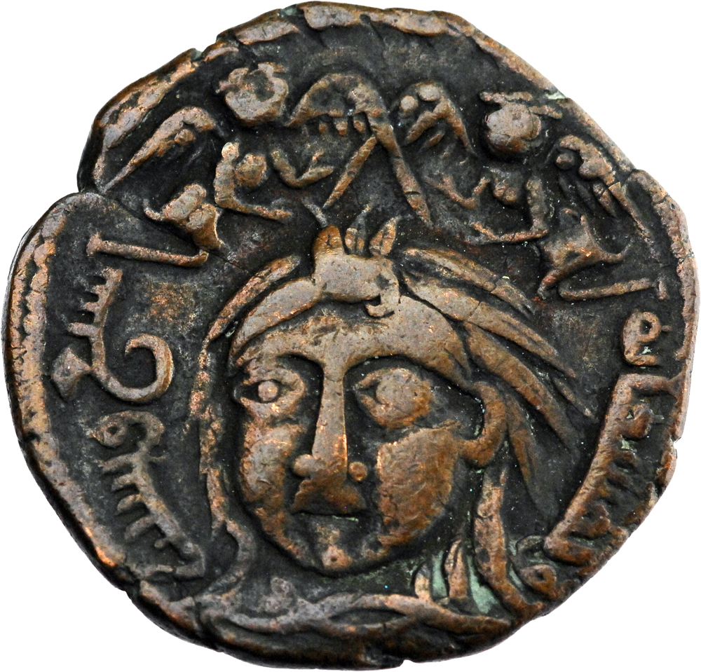 Buste drapé, de face légèrement à gauche, portant une coiffe nouée au front ; deux anges au-dessus.