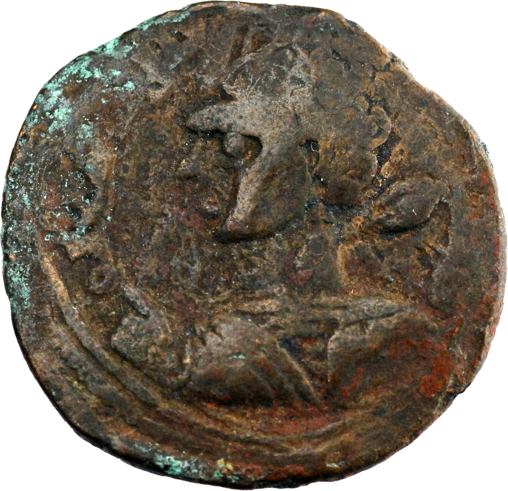 Buste à la tête bouclée à gauche, un sceptre au-dessus de l’épaule.